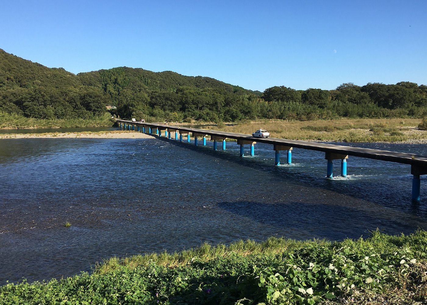 現場で香川に来ています。初の四国上陸なので、休日は様々な場所を巡っていますが、特に印象に残っている場所は、高知の四万十町近辺にある沈下橋です。観光名所となっており、とても心地よく、山と透き通った水が流れる川を眺めることができました。写真は佐田沈下橋という、沈下橋の中でも有名な橋です。写真で分かるように、道路に手摺やガードレールが無いため、これもまた新鮮でした。